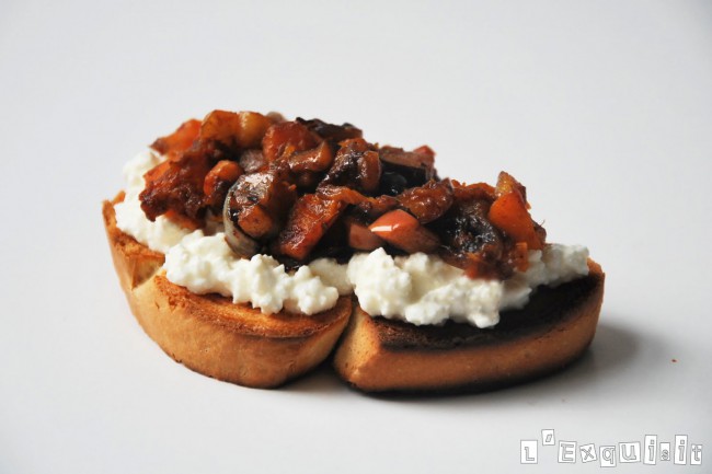 - Untar la ricotta en las rebanadas de pan recién tostadas. Poner encima la calabaza y luego la cebolla.